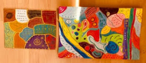 gemalt und dann mit Schnüren oder Wolle umrandet. Ein toller 3 D Effekt als Bild.
